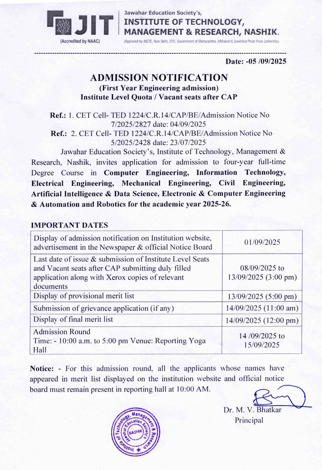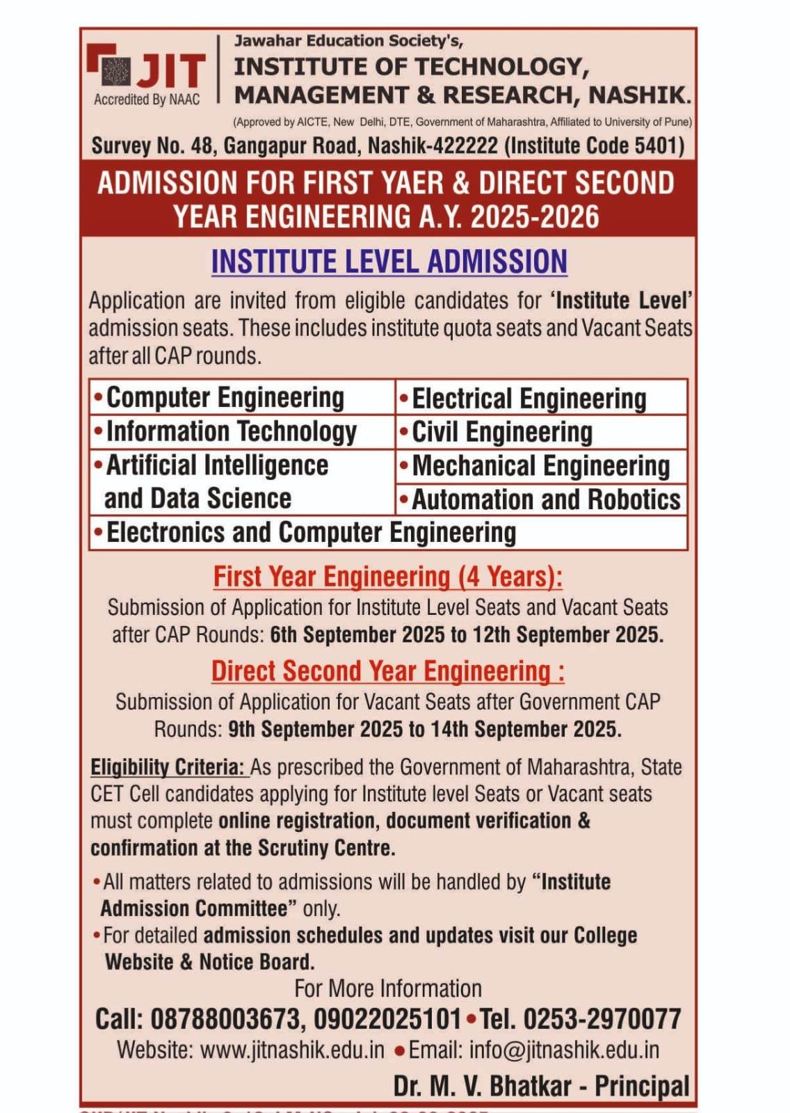 | Sr. No. | Code | Name of Program | Intake | (CAP) Seats | Institute Level Seats |